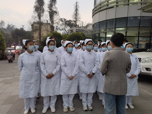 当日上午八点,在yl23455永利集团廖林梅老师的带领下,同学们穿戴整齐到达市医院行政楼下集合。市医院护理部副主任周昀霞对公司老师及订单班员工的到来表示了热烈的欢迎,对医院的情况做了详细的介绍,并就临床学习中着装规范、人身财产安全、职业防护等内容提出了要求,最后希望同学们能认真学习,尊敬师长,勤学善思,尽快融入。随后,订单班的成员进行了人员编排,分别进入各个科室。