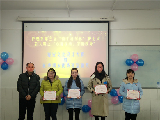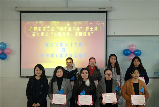 展宿舍文化,扬青春风采。12月20日12:30,护理系第三届“南丁格尔”杯护士风采大赛之“心随我动,家随我秀”寝室文化设计大赛决赛暨2016年秋季学期优秀寝室颁奖典礼在教学楼B205隆重举行。护理系团总支书记万黎,学管干事李杨、辅导员陈静出席并担任此次活动的评委。