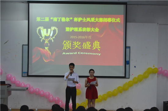 为表彰先进,树立榜样,更好地发挥优秀同学的带动和引领作用,6月21日18:30,我系在阶梯102教室举行了第二届“南丁格尔杯”护士风采大赛闭幕仪式暨护理系表彰大会。护理系党支部副书记李敏、团总支书记万黎、团总支副书记吴玉阳及邓雯、护理系老师唐佳、邓蓓 、饶玲、廖林梅、任冬梅、袁倩、闵捷等莅临现场,与各获奖班级代表和员工会全体成员共同见证这一激动的时刻。