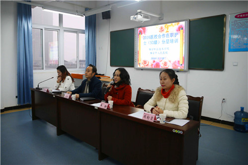 1月18日上午,公司与雅安市人民医院2016年医校合作在职护士分层培训开班仪式在青年路校区实训楼607隆重举行。yl23455永利集团党委书记张大凯、雅职院附属医院护理部主任冯贤萍,雅安市人民医院护理部副主任周昀霞、护理系相关负责人以及公司附属医院和市人民医院N3级别的34名护士参加了开班仪式。护理系主任王静主持开班仪式。