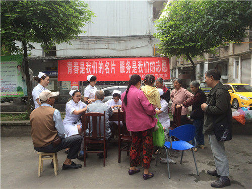 2015年5月26日下午,护理系青志协的南丁格尔志愿者们在上坝路社区绿洲路36号大院开展了“健康进社区”的义诊活动。