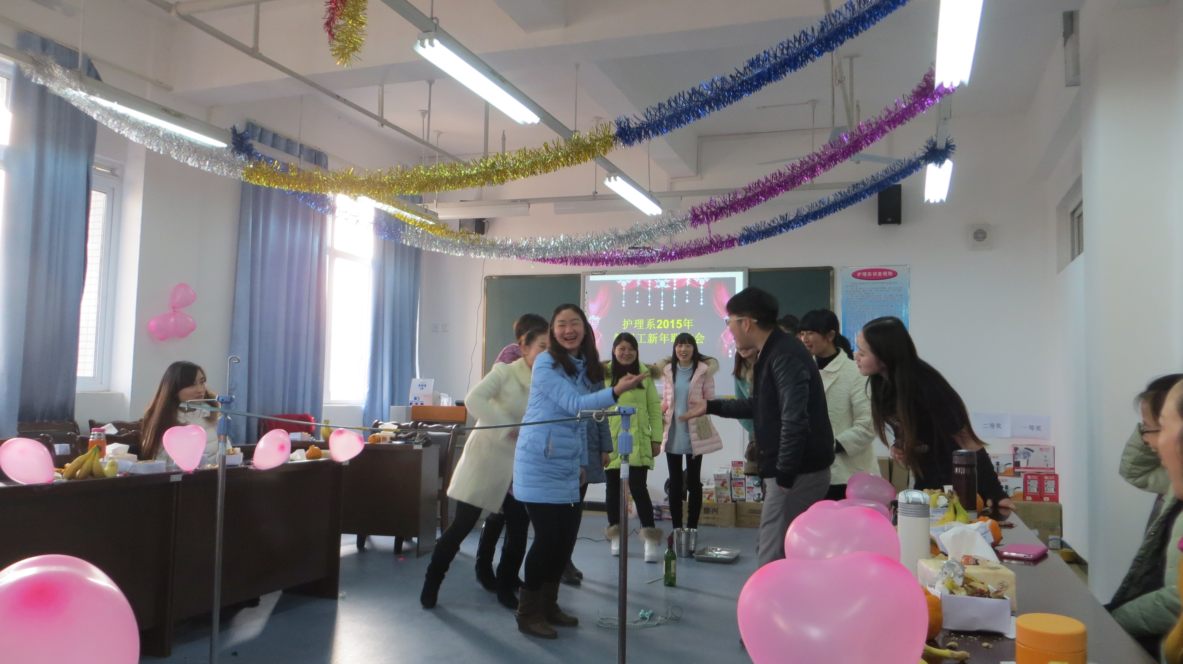 为展示教职工的活力与风采,增强全系凝聚力,12月30日下午护理系2015年教职工新年联欢会在青年路校区实验实训大楼607隆重举行,全系教职员工相聚在一起共同庆祝新年的到来。联欢会由谢琳娜、闵捷两位老师主持。联欢会上,系主任王静、党支部书记郭英才对全系教职工的付出和辛勤劳动表示感谢,回顾了2014年系部取得的成绩,提出了对2015年的美好憧憬。