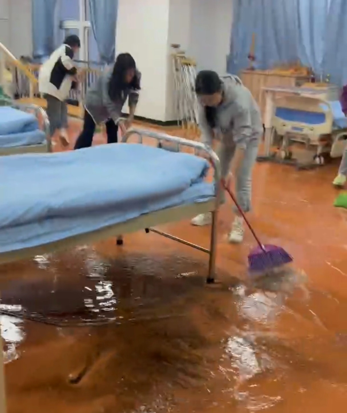 抢险现场呈现高效协作的生动画面:面对当前楼层工具紧缺情况,志愿者们迅速分组,到各楼层借用扫帚、拖把,利用废弃纸箱、毛巾等吸附积水。清理过程中,积水渐渐渗透鞋袜、浸湿裤腿,但志愿者们仍坚守岗位,无暇顾忌自身。“当时积水已经没到脚踝,但看到大家都泡在水里义无反顾清扫、搬运设时备,我只想着快点再快点。"其中一名志愿者同学说到。