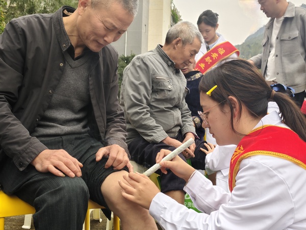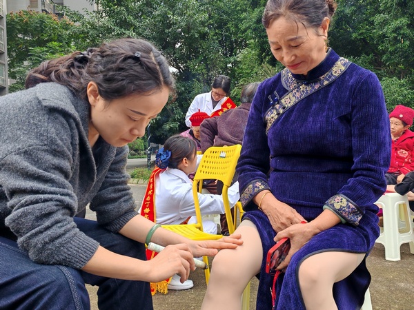 与此同时,杨苓梅、吴政武老师带领同学们运用所学专业知识,为老人进行艾灸理疗。同学们点燃艾条,精准选取穴位,帮助老人温经通络,展现出护理人扎实的技能素养与温暖的人文关怀。