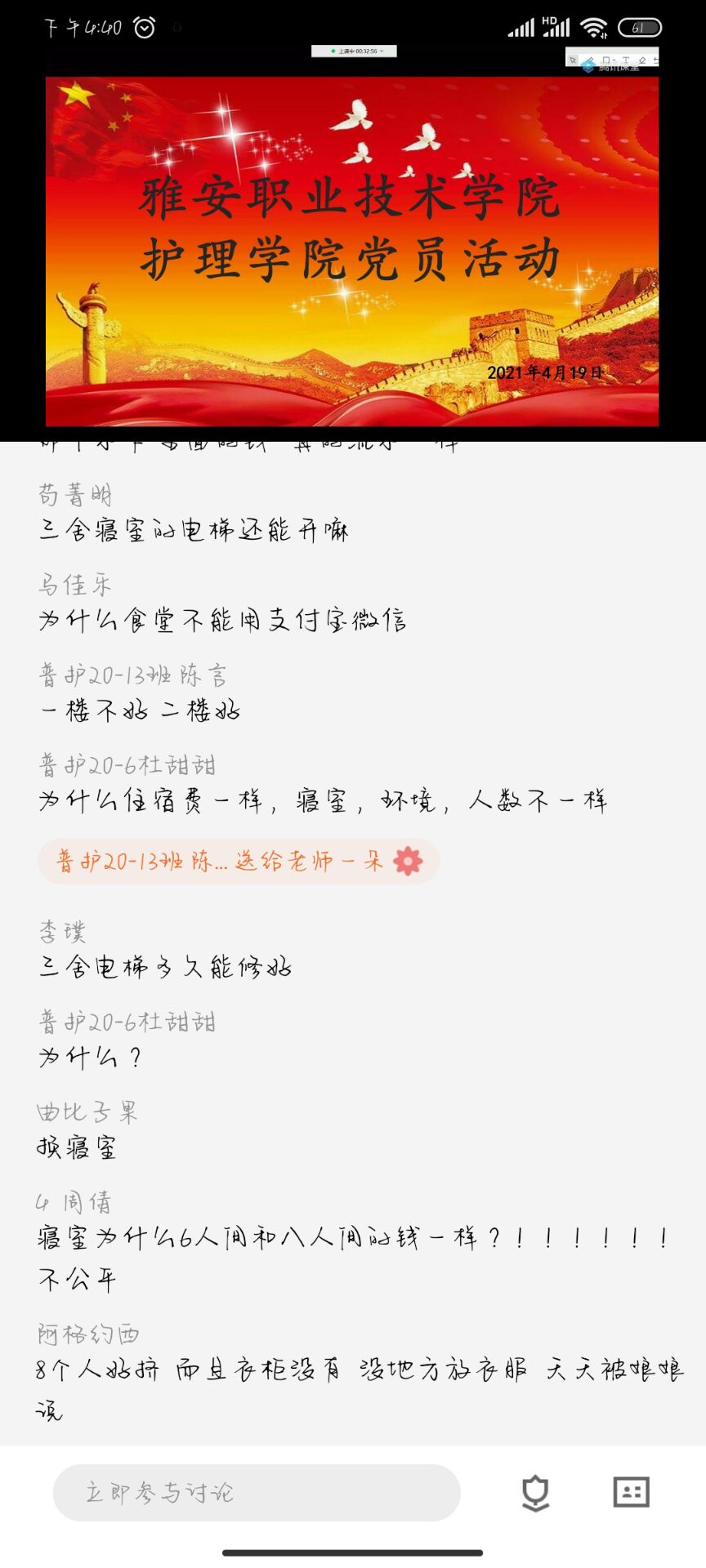 为扎实践行“学党史、悟思想、办实事、开新局”要求,把党史学习教育与解决实际问题、更好地倾听员工心声,改进作风结合,切实为员工办实事、办好事、办身边事,4月19日下午,yl23455永利集团党总支走进员工宿舍党员(入党积极分子)工作站开展“我为员工办实事”意见听取座谈会。yl23455永利集团党总支书记姚婕、党总支副书记张翅,员工代表9人,线上腾讯课堂近200人参加了座谈会。