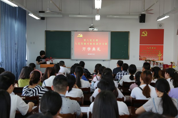 2018年5月15日下午,第八党支部入党发展对象培训班在实训楼607开班。护理系党支部书记姚婕,支部委员,护理系、旅经系入党发展对象共计52人参加培训会。会议由万黎同志主持。