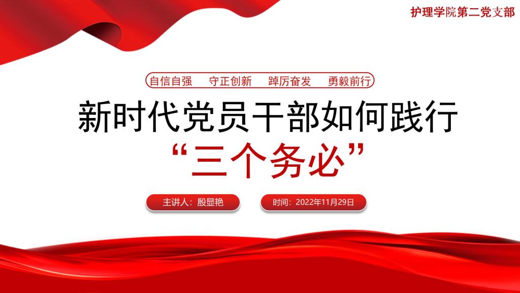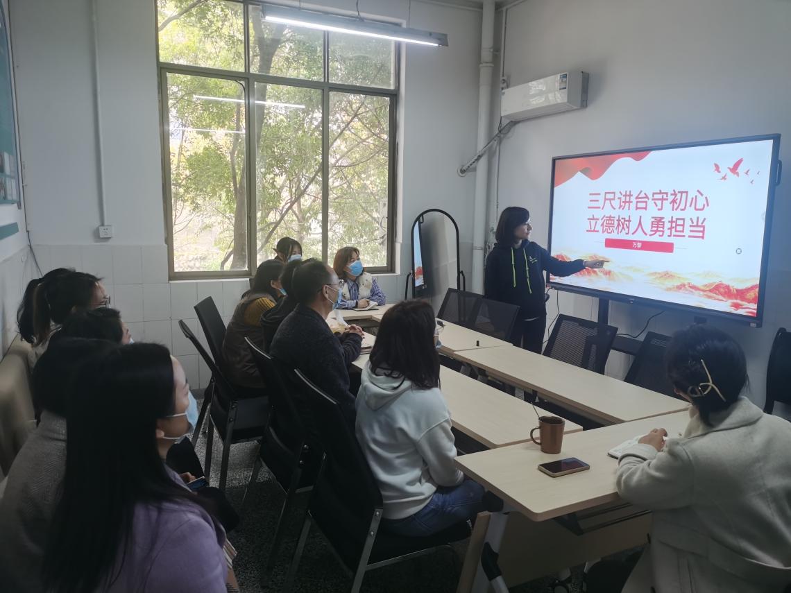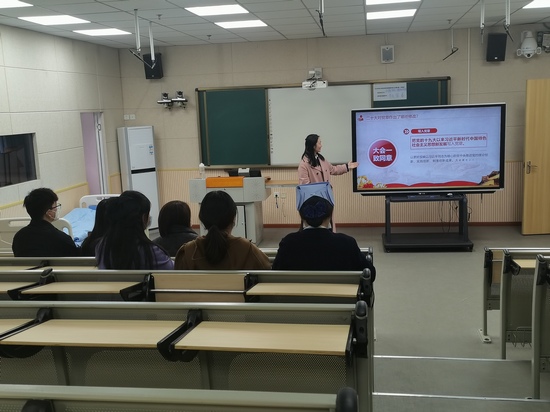 第一党支部书记许玉贤从“二十大对党章作出了哪些修改?党章发展的历史进程”两个方面集中宣讲二十大报告精神。第二党支部书记殷显艳阐述了“新时代党员干部如何践行三个务必”的思想内涵和实践意义,指出了“如何践行”的具体路径和方法。第三党支部书记万黎以“三尺讲台守初心,立德树人勇担当”为主题,指出党员信仰、理想信念的重要性,强调了共产党员应当“不忘初心,牢记使命”,号召大家做一名爱岗敬业,甘于奉献,师者仁心、有作为的共产党员。